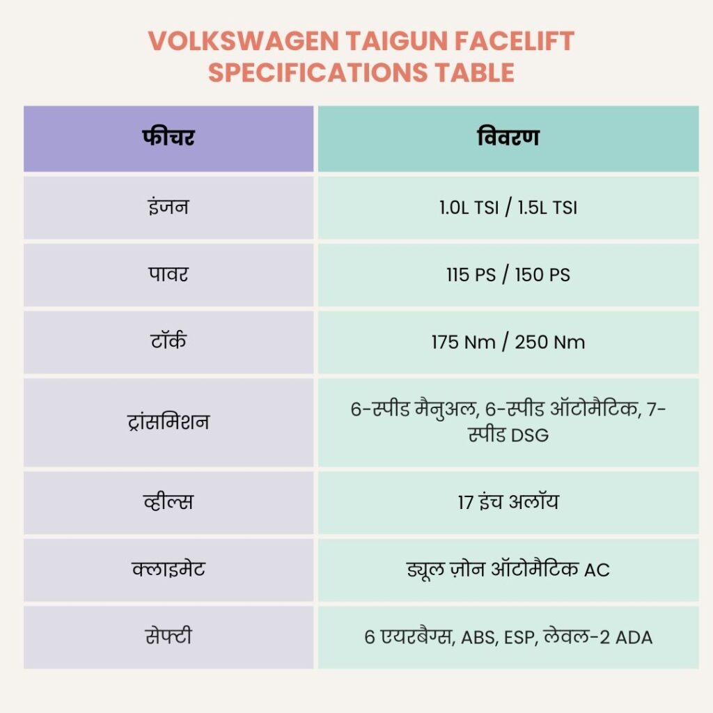 Volkswagen Taigun Facelift India 2025: स्पेसिफिकेशन टेबल