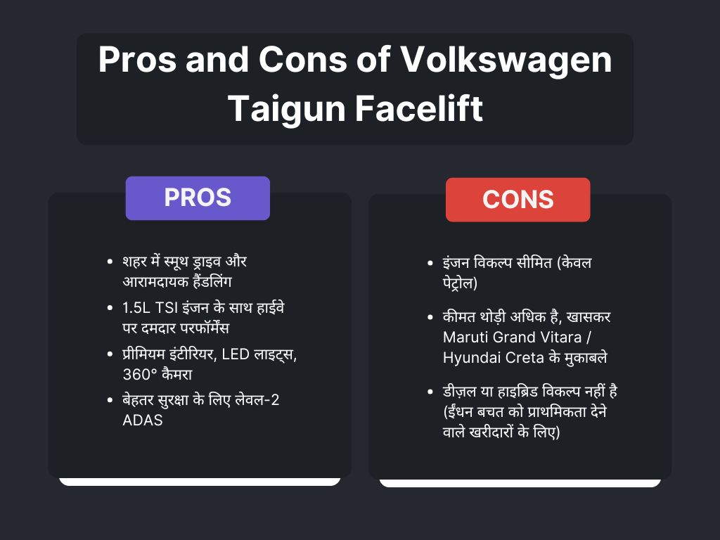 - अगर आप मिड-साइज़ SUV चाहते हैं, जो premium feel + modern features दे, तो Taigun facelift सही विकल्प है